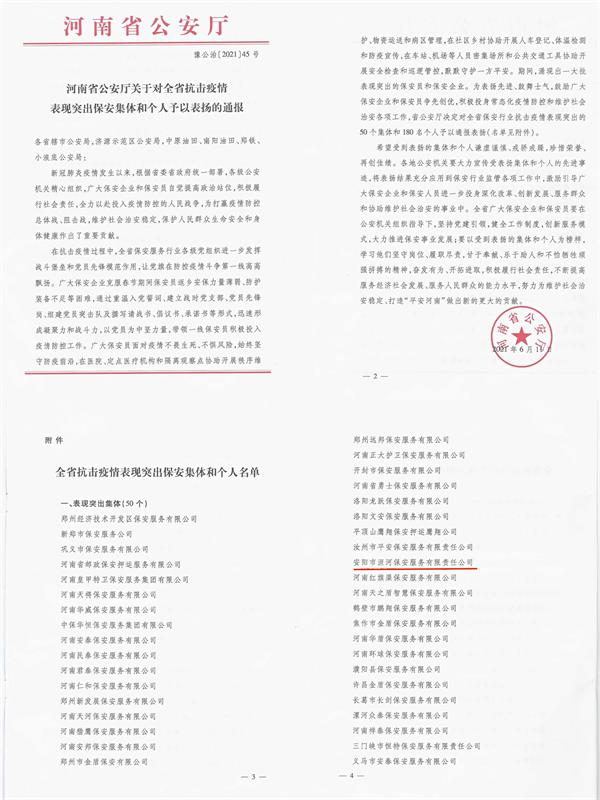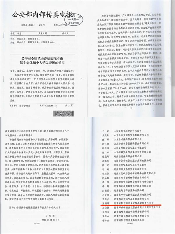為表揚先進、鼓舞士氣,鼓勵廣大保安企業(yè)和保安員爭先創(chuàng)優(yōu),積極投身常態(tài)化疫情防控和維護社會治安各項工作,公安部公傳發(fā)【2020】276號、河南省公安廳豫公治【2021】45號文件,通報表揚保安行業(yè)抗擊疫情表現(xiàn)突出集體和個人。其中安陽市洹河保安服務(wù)有限責任公司榮獲“全省抗擊疫情表現(xiàn)突出集體”;公司黨委書記、董事長、總經(jīng)理王高峰榮獲“全國抗擊疫情表現(xiàn)突出個人”榮譽稱號。