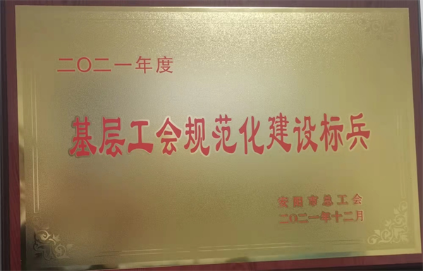 近日,公司工會被安陽市總工會授予“2021年度安陽市基層工會規(guī)范化建設(shè)標(biāo)兵”榮譽(yù)稱號。