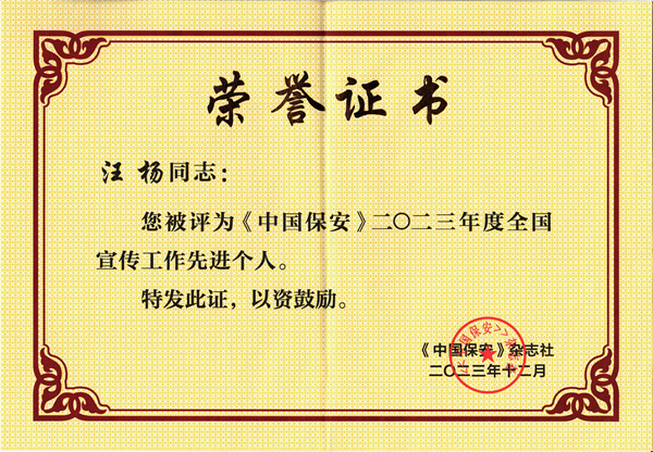 2023年12月,《中國(guó)保安》雜志對(duì)2023年度全國(guó)保安行業(yè)宣傳工作成績(jī)突出的集體和個(gè)人進(jìn)行了表彰,公司綜合辦公室汪楊同志榮獲“2023年度全國(guó)宣傳工作先進(jìn)個(gè)人”稱號(hào)。