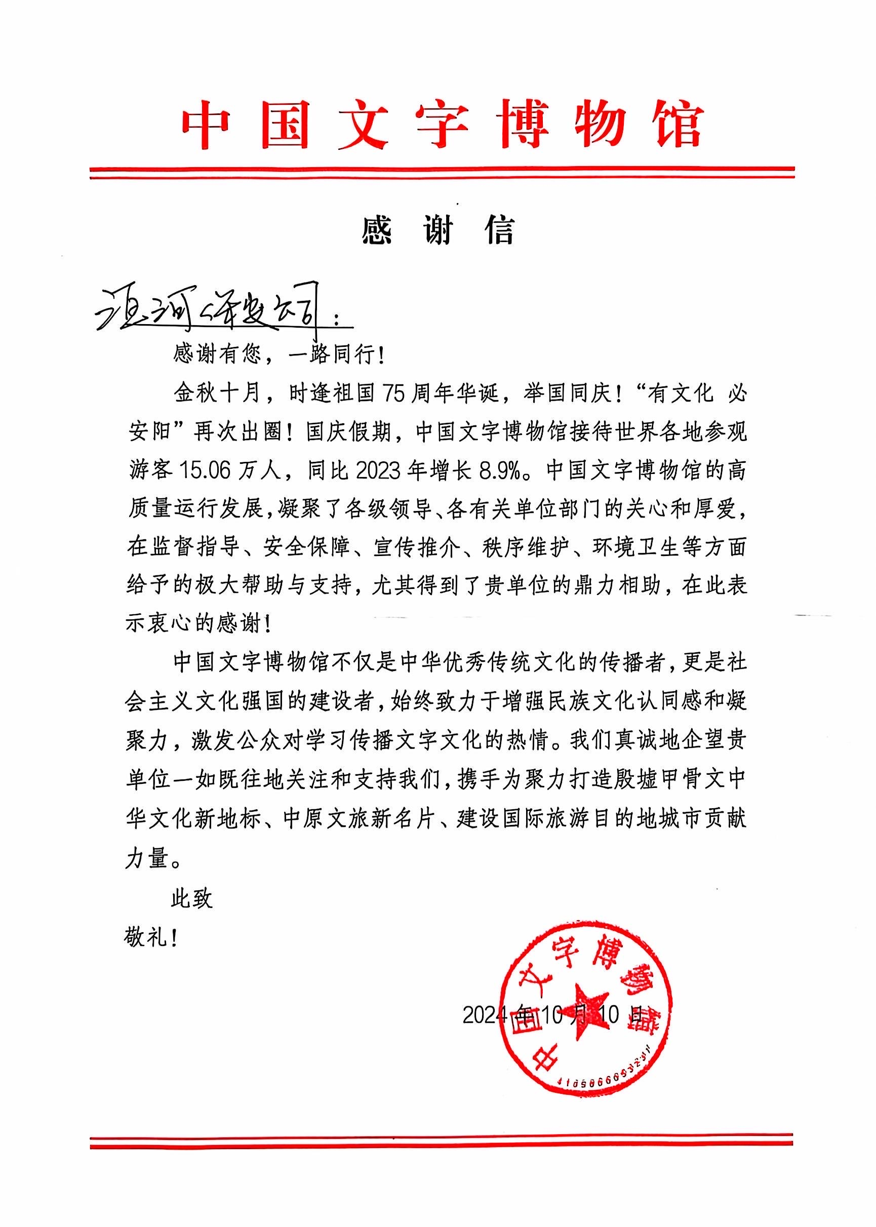 10月12日,中國(guó)文字博物館安全保衛(wèi)部主任孫琳杰專程來(lái)到我公司,送來(lái)一封感謝信,以此感謝今年國(guó)慶期間公司在安全保衛(wèi)工作中所付出的努力和作出的貢獻(xiàn)。此次國(guó)慶期間,中國(guó)文字博物館接待世界各地參觀游客15.06萬(wàn)人次,參觀人數(shù)多、時(shí)間長(zhǎng)、影響面廣,公司全體保安員盡職盡責(zé),嚴(yán)格落實(shí)各項(xiàng)安保措施,以飽滿的熱情和敬業(yè)的工作態(tài)度,為博物館安全作出了積極貢獻(xiàn)。