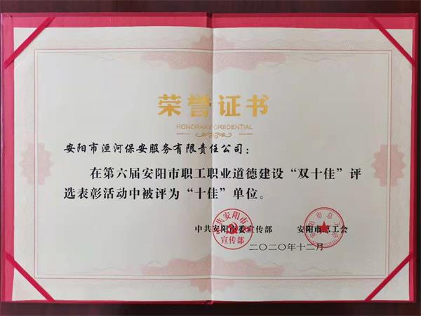 為深入學(xué)習(xí)貫徹習(xí)近平新時(shí)代中國特色社會主義思想和黨的十九大精神,積極踐行社會主義核心價(jià)值觀,進(jìn)一步提升職工職業(yè)道德建設(shè)水平,為決勝全面建成小康社會,加快實(shí)現(xiàn)“一個重返、六個重大”目標(biāo)任務(wù),建設(shè)新時(shí)代區(qū)域性中心強(qiáng)市作出新的更大貢獻(xiàn),日前,經(jīng)安陽市“雙十佳”評委會評審,中共安陽市委宣傳部、安陽市總工會決定:授予安陽市洹河保安服務(wù)有限責(zé)任公司“安陽市職業(yè)道德建設(shè)十佳單位”榮譽(yù)稱號。