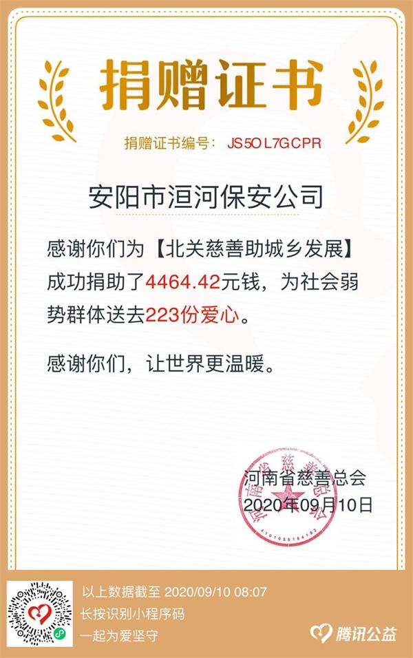 近年來,安陽市洹河保安服務(wù)有限責(zé)任公司一直關(guān)心群眾生活、支持公益事業(yè)發(fā)展,積極履行社會責(zé)任,通過積極開展“疫情捐款”、“慈善捐款”、志愿服務(wù)等活動扶貧濟(jì)困、助人為樂,讓支持參與公益事業(yè)成為廣大干部職工的自覺和習(xí)慣,源源不斷向需要幫助的群眾傳遞更多的溫暖和關(guān)愛,形成“人人參與,傳遞正能量”的好風(fēng)尚,在建立社會救助體系、推動安陽慈善事業(yè)發(fā)展中貢獻(xiàn)力量。