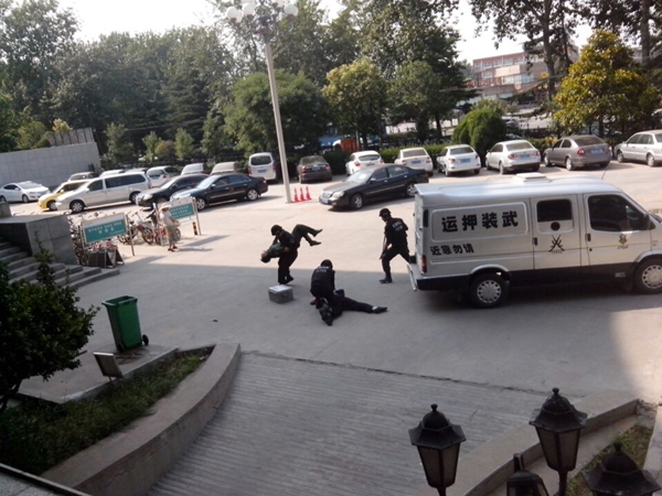 10月15日,守押二大隊(duì)在農(nóng)業(yè)銀行安陽市行院內(nèi)開展了一次暴恐突發(fā)事件應(yīng)急演練暨消防安全培訓(xùn)。本次演練共設(shè)置兩個(gè)科目分別為:遭遇持械搶劫運(yùn)鈔車事件處置演練、消防器材實(shí)操及現(xiàn)場滅火應(yīng)急預(yù)案演練。