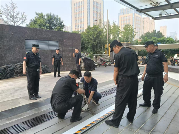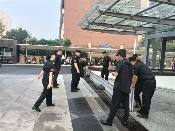 此次演練模擬了暴雨導致雨水倒灌、地下停車場積水等險情。全體隊員迅速響應,按照預案分工協(xié)作,保安隊員第一時放置擋水板和堆砌沙袋,并將重要物資轉移安全。