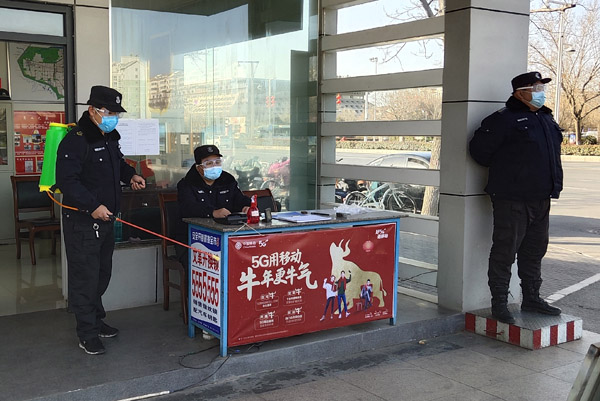 目前,中隊全體隊員表示,要以飽滿的工作熱情積極工作,保障客戶安全,為客戶度過一個平安祥和的春節(jié)做出自己的貢獻。圖為隊員在學習疫情防控知識、對崗點進行消殺、測量外來人員體溫。