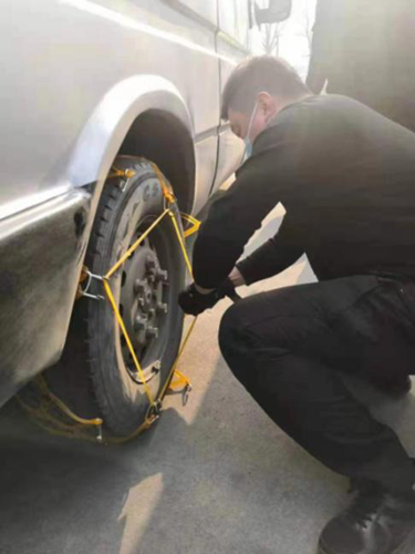 演練科目包括,押運車行駛在途中輪胎突然爆胎更換輪胎、下雪天運鈔車換防滑鏈和運鈔車發(fā)生火災。演練中,各車組成員按照自己崗位角色和職責分工,演示突發(fā)事件中押運員警戒站位、交接員轉移款箱、駕駛員更換輪胎、給輪胎安裝防滑鏈、滅火等。按照預案,參演人員都能做到忙而不亂,有序進行。