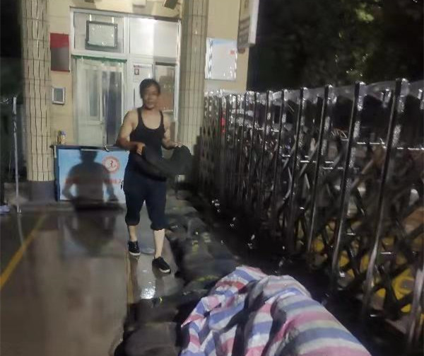 零點五十分,雨勢突然變大,短短十幾分鐘的雨量,已經(jīng)把學校門口的慢車道全部淹沒,積水馬上就要涌入校園。雨情就是警情,汛情就是命令。防汛排險,刻不容緩。何濤立刻打上雨傘,開始用防汛沙袋封堵大門,由于雨下的很急,雨傘多次被打落,他直接把雨傘扔到一邊,雙手搬起了沙袋,很快便壘起了一面沙墻,及時將雨水堵在校門之外。