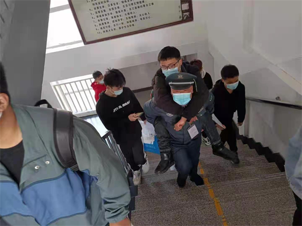 10月30日上午9點(diǎn),在安陽(yáng)市第八中學(xué)教師資格證考試入場(chǎng)前,看到一位校園保安將一名考生從一樓背上四樓,在場(chǎng)的考生、監(jiān)考老師對(duì)這位校園保安的舉動(dòng)嘖嘖稱贊。