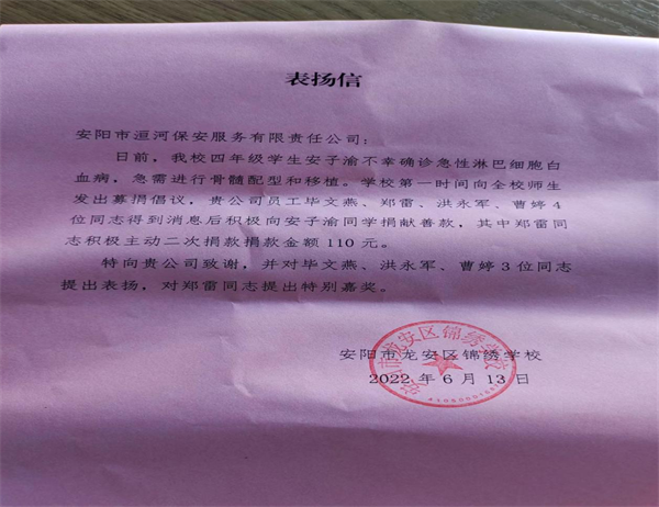 6月13日,錦繡學(xué)校四年級學(xué)生安子渝不幸確診急性淋巴細(xì)胞白血病,急需進(jìn)行骨髓配型和移植。學(xué)校第一時間向全校師生發(fā)出募捐倡議,人防四大隊駐學(xué)校員工畢文燕、鄭雷、洪永軍、曹月婷 4位同志得到消息后積極向安子渝同學(xué)捐獻(xiàn)善款,其中鄭雷同志積極主動二次捐款110元。錦繡學(xué)校得知情況后提出對畢文燕、洪永軍、曹月婷進(jìn)行表揚,對鄭雷特別嘉獎,向洹河公司發(fā)來表揚信。