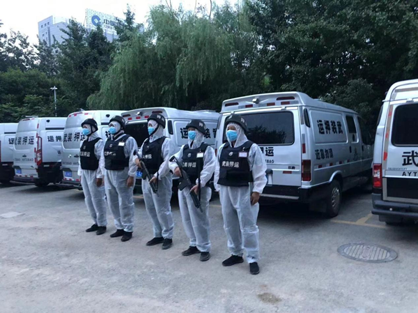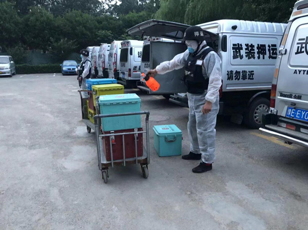 為確保守押隊員人身安全,同志們按照《疫情防控期間押運應(yīng)急工作預(yù)案》,嚴格執(zhí)行辦公區(qū)域和押運車輛的消殺、防護裝備的檢查與消毒等防疫程序,執(zhí)行勤務(wù)時身穿全套防護服。