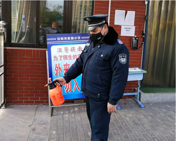 疫情發(fā)生后,人防一大隊80名校園保安按照公司、大隊和學校領導要求始終戰(zhàn)斗在抗疫工作前沿。在這場看不見硝煙的戰(zhàn)疫中涌現(xiàn)出許多沖鋒陷陣、主動協(xié)助學校開展防疫工作的保安隊員。紅廟街小學保安班長袁和平,每天除了做好本職工作,對進入校園的人員測量體溫,認真登記,守好學校防控疫情的首道防線外,還主動給學校校園和辦公室噴灑消毒液。無論白天與黑夜,只要客戶需要,他都隨叫隨到,為學校防控疫情工作做出自己的貢獻。
