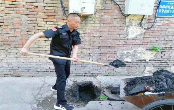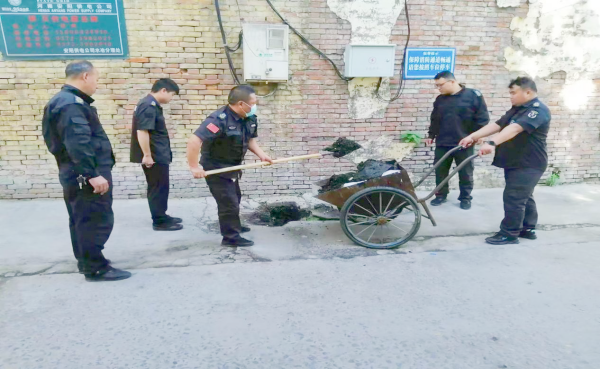 董偉得知情況后,立即組織隊員趕往現(xiàn)場進行查看,經(jīng)排查發(fā)現(xiàn)污水外溢是由后院下水道沉淀池堵塞,造成營業(yè)廳污水難以排放。為徹底整治下水道堵塞這一“頑疾”,董偉安排水冶本地隊員從家里拿來鐵揪、手推車等工具,組織隊員對沉淀池進行徹底清理。當(dāng)翻開沉淀池窨井蓋時,面對臭氣熏天的淤泥,隊員們沒有絲毫的退縮,頂著刺鼻的氣味,大家一起動手,將堵塞的淤泥、樹葉、生活垃圾等集中用推車清運拉走。下水道疏通后,隊員又提水把周圍污染的路面清洗干凈。下水道通了,路面也干凈了,大家的心情也舒暢了。