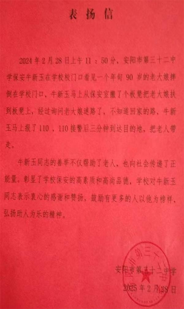 隊員牛新玉的善舉不僅幫助了老人,也向社會傳遞了正能量,彰顯了洹河保安的高素質和高尚品德。學校特寫出表揚信對牛新玉同志表示衷心的感謝和贊揚,鼓勵更多的人以他為榜樣,弘揚助人為樂的精神。