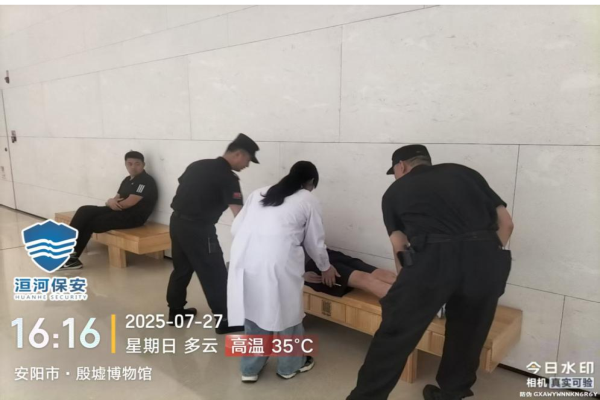 7月27日15:40,殷墟博物館特保大隊隊員王德爭與李亞偉在二樓日常巡邏時,發(fā)現(xiàn)一名五十多歲男游客面色異常,二人立即上前關切詢問,游客自述頭暈不適。王德爭第一時間通過對講機聯(lián)系一樓當班班長王巖。王巖迅速響應,立即帶領醫(yī)護人員趕赴二樓現(xiàn)場。醫(yī)護人員到場后,當即為游客測量血壓,發(fā)現(xiàn)其血壓高至170,經(jīng)進一步細致檢查,確認游客可能因低血糖導致,讓游客口服水果糖緩解,暫無緊急危險。處置期間,王德爭、李亞偉負責維護現(xiàn)場秩序,為救助工作的順利開展提供保障。隨后,王巖聯(lián)系到游客家屬。待家屬趕到后,特保隊員小心護送游客至東門出口,并貼心叮囑家屬陪同游客前往就近醫(yī)院做進一步檢查。