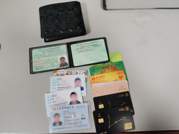 10月4日凌晨1點多,技防分公司夜間巡查人員在中國銀行永明路支行自助ATM機巡查時,發(fā)現(xiàn)一個錢包,經(jīng)過檢查,錢包內(nèi)有身份證、駕駛證、港澳通行證及多張銀行卡等,巡查人員立即上報中國銀行值班人員,然后將錢包交到監(jiān)控中心保管。
