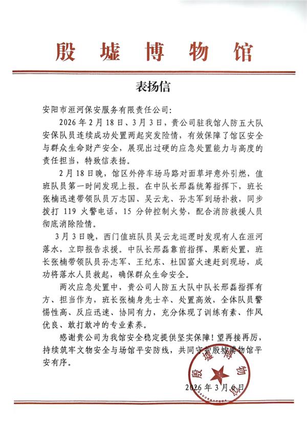 此次表揚信,既是對人防五大隊應急處置工作的認可,更是對洹河保安整體服務水平的肯定。下一步,大隊將以此為動力,持續(xù)強化隊伍應急能力建設,筑牢文物安全與場館平安防線,為守護殷墟博物館平安有序運行、保障人民群眾生命財產安全貢獻更大力量。