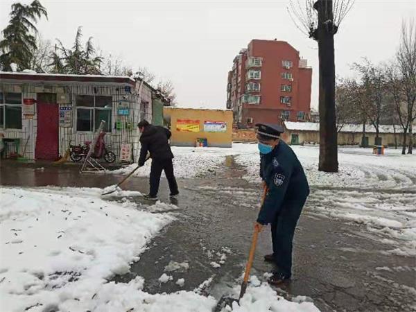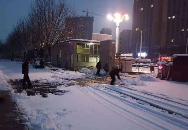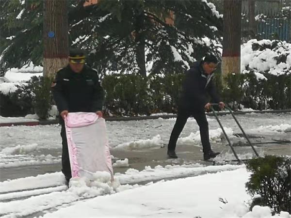為盡快消除積雪給學(xué)校道路交通帶來的諸多不便,各個(gè)班組接班的隊(duì)員提前到崗,下班的隊(duì)員晚點(diǎn)下班,投入掃雪工作。雖然天氣有點(diǎn)冷,但是大家全然不顧,一個(gè)個(gè)爭先恐后,各個(gè)駐學(xué)校的保安揮動著手中的鐵鍬、大掃帚,配合默契、干勁十足,齊心協(xié)力,鏟的鏟、推的推、掃的掃。經(jīng)過近一個(gè)小時(shí)的奮戰(zhàn),學(xué)校主要區(qū)域的雪已被清除干凈。