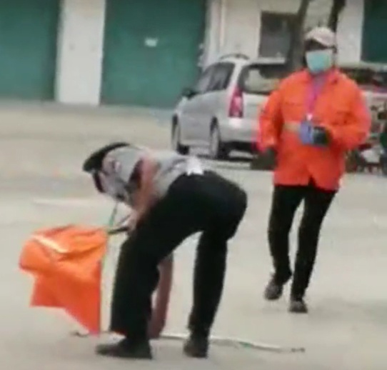 下午2點40許,保潔車經過4號門,路面不平,工具掉落地上,人防二大隊王紅軍喊停環(huán)衛(wèi)人員,幫其撿起清潔工具。