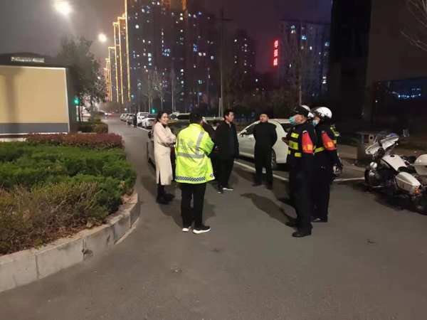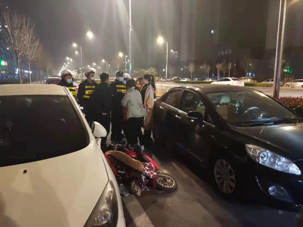 3月14號(hào)晚上8點(diǎn)40分左右,人防一大隊(duì)派駐高新區(qū)分局巡防隊(duì)徐強(qiáng)、郝文佺,閆志強(qiáng),孫守偉,宋立等5名隊(duì)員在轄區(qū)巡邏,行至開(kāi)發(fā)區(qū)佳田未來(lái)城小區(qū)西門非機(jī)動(dòng)車道看到一起交通事故。當(dāng)時(shí),事故雙方情緒激動(dòng),在激烈爭(zhēng)吵,還有一名小孩受輕傷。