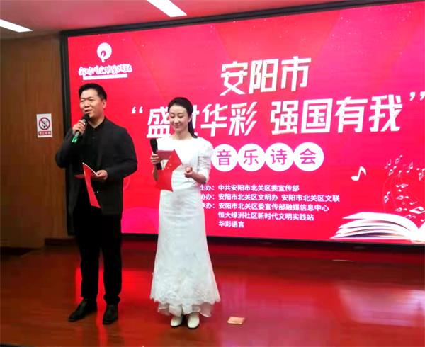 2021年10月17日下午,安陽市“盛世華彩 強(qiáng)國有我”音樂詩會在恒大綠洲社區(qū)新時(shí)代文明實(shí)踐站二樓宣講中心隆重舉行。安陽市總工會宣教部部長、市職工作家協(xié)會主席、市作家協(xié)會副主席、市文聯(lián)兼職副主席張艾敏觀看表演。公司培訓(xùn)中心王曉丹同臺獻(xiàn)藝。