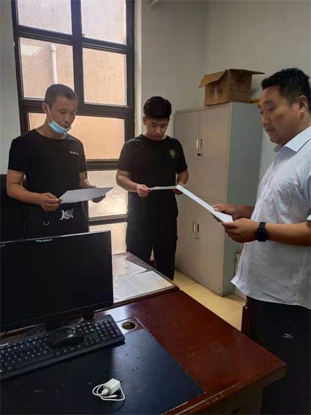 圖為副大隊(duì)長李衛(wèi)國對(duì)萬隆物業(yè)、石油公司崗點(diǎn)班長以上人員進(jìn)行排查報(bào)告清單的填寫,收集存在問題。