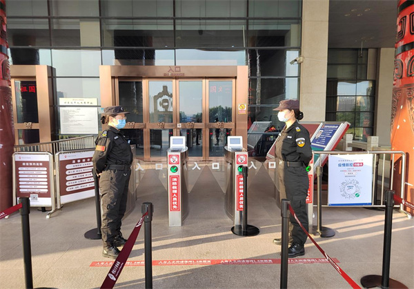 根據(jù)工作職責,外圍隊員負責查驗游客佩戴口罩、場所碼、48小時核酸檢測陰性報告、電子門票預約等。女子班隊員負責安檢,提醒游客有序掃碼掃票,并進行危險物品檢查。各展廳隊員在崗在位,維護參觀秩序。大家不畏辛苦,堅守崗位履職盡責,國慶期間共接待游客約2萬人次,平均每日3000人次,圓滿完成各項安保任務。