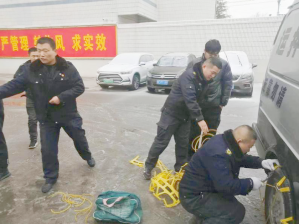 上午收車回來(lái)后,楊中朝立即督促各車組人員及時(shí)檢查防滑鏈,詢問(wèn)押運(yùn)途中的工作路況信息,并對(duì)車長(zhǎng)司機(jī)提出要求,一是要注意特殊路段的道路情況,所有車組至少配齊兩套防滑鏈,避免防滑鏈斷裂,偏遠(yuǎn)線路要攜帶三條防滑鏈;二是要減速慢行,不要強(qiáng)行超車,勻速30-40公里行駛,車長(zhǎng)要密切配合司機(jī)觀察路況;三是要用對(duì)講機(jī)與大隊(duì)保持聯(lián)系,及時(shí)與客戶溝通,取消偏遠(yuǎn)網(wǎng)點(diǎn)的款箱運(yùn)送,調(diào)整下午點(diǎn)名時(shí)間,提前出車,不惜一切代價(jià)堅(jiān)決打贏這次低溫冰雪天氣攻堅(jiān)戰(zhàn)。