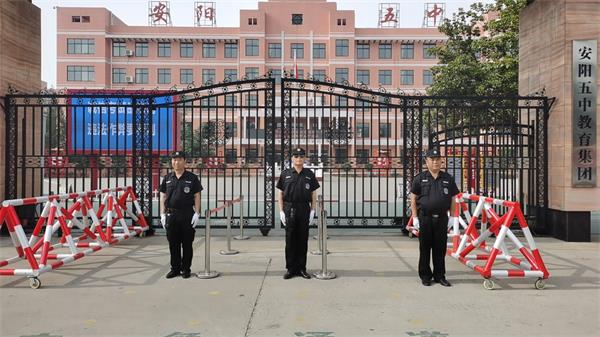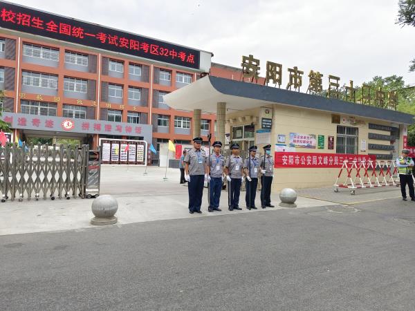 場內考生奮筆疾書,場外保安堅守崗位,兩份不同的答卷,同樣需要認真負責、盡心盡力,考生一舉中魁不負青春年華,保安隊員在大“烤”中用安保行動書寫平安答卷。