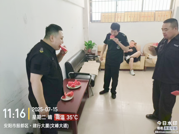 連日來,高溫天氣持續(xù)“烤”驗(yàn)著堅(jiān)守在崗位一線的守押人員。為有效緩解高溫帶來的不適,保障隊(duì)員們身體健康,7月15日,守押五大隊(duì)特意采購(gòu)了一批新鮮甘甜的西瓜,為堅(jiān)守崗位的隊(duì)員們送去清涼與關(guān)懷。