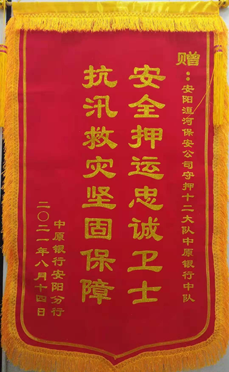 中原銀行安陽分行行長吳擁軍親自為守押十二大隊贈送了錦旗并贈言:押運隊員在這次抗擊災(zāi)情的戰(zhàn)斗中,面臨險情,不懼危險,身先士卒,敢打敢拼,勇往直前,為這次突如其來的災(zāi)情作出了突出的貢獻(xiàn);體現(xiàn)了寶貴的擔(dān)當(dāng)精神,彰顯了洹河押運隊伍訓(xùn)練有素的過硬作風(fēng)和鋼鐵意志。 受到表彰是好事,是對我們的鼓勵和認(rèn)同;同時,我們更要鞭策自己,激勵自己,提升更好的服務(wù)質(zhì)量服務(wù)客戶,回饋公司。