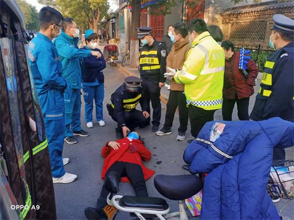 早上7點(diǎn)50分許,巡防隊(duì)員王軍清、梁子力,完成學(xué)校護(hù)校崗安保任務(wù)后,在返回單位途中,發(fā)現(xiàn)文峰北路與三道街交叉口車輛行駛極其緩慢,造成道路擁堵。王軍清立即下車查看,原來是一輛轎車與一輛電動(dòng)車發(fā)生碰撞,導(dǎo)致電動(dòng)車側(cè)翻倒地,一名約70歲的老人摔倒在地,見此情形,執(zhí)勤隊(duì)員連忙上前詢問查看,發(fā)現(xiàn)該老人表情痛苦,外觀有輕微傷。