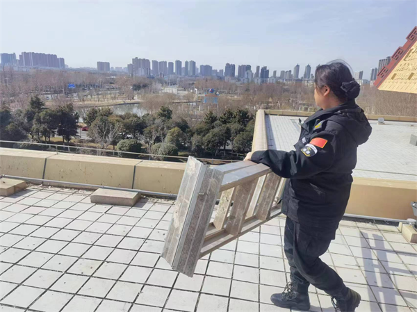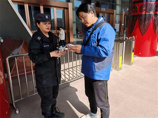 原來事情是這樣的。2月15日午時,趙書娜巡邏時發(fā)現(xiàn)廣場上空有無人機飛行,便立即尋找無人機操控人員,當巡查到宣文館喂鴿子處時,發(fā)現(xiàn)有一名游客正在操控無人機,趕忙上前勸阻。這時無人機剛好電量低掉落在高數(shù)十米的宣文館平臺上,該游客情緒有點波動,請求工作人員將其撿回。趙書娜隨即聯(lián)系中隊長,向館方上報情況后取來備用鑰匙。隨后,趙書娜和中隊長搬著梯子一同到三樓、四樓平臺尋找,終于在四樓平臺找到掉落的無人機。經(jīng)核實無誤后,聯(lián)系無人機機主在安檢進行登記認領(lǐng),該名游客自稱是從北京前來參觀。