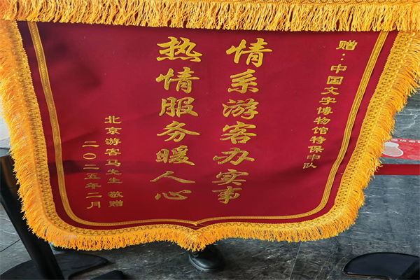 2月16日,一名北京游客將一面“情系游客辦實事 熱情服務(wù)暖人心”的錦旗送到特保大隊派駐中國文字博物館特保中隊,表達對特保隊員不顧恐高、幫助找到墜落無人機的感激之情。