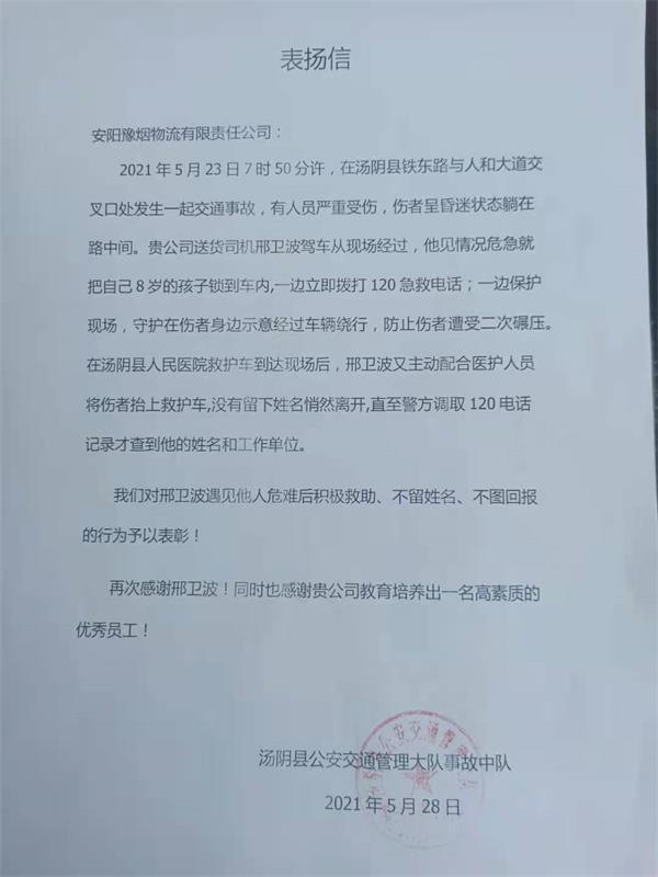 當大家問及邢衛(wèi)波當時情況和心中所想時,這位老兵黨員只是憨厚地回答:“當時也沒有想那么多,只是覺得救人是第一位的!” 據(jù)悉,6月3日下午,湯陰縣公安交通管理大隊事故中隊工作人員曾帶著一封表揚信來到安陽豫煙物流公司,感謝邢衛(wèi)波,對邢衛(wèi)波見義勇為,積極救助傷者的行為予以表揚。