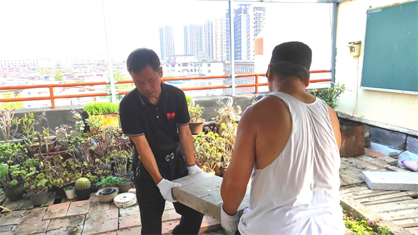 由于該校教學(xué)樓上遺留有一定數(shù)量的花池、石塊、石槽、建筑塊、水泥塊、地板、磚等物,校方排查存在安全隱患,需要把樓頂?shù)臇|西清運(yùn)下來。按照支部組織謀劃安排,當(dāng)日上午8點(diǎn)半,在黨員、中隊長劉宇,預(yù)備黨員、副中隊長楊承濤帶領(lǐng)下,同志們齊心協(xié)力、相互配合,采取接力方式向下轉(zhuǎn)運(yùn)。有的一塊石頭有二三百斤,他們就用繩子捆住向下抬,一個個累得汗流浹背,但沒有一個人叫苦叫累,張運(yùn)洲邊干邊反復(fù)提醒大家注意安全。他們利用一上午時間,把大部分體積較大的石塊、石板、地磚等物安全清理下樓,又把清運(yùn)堆積在樓道的東西,搬運(yùn)到200米外的樓后隱蔽處。